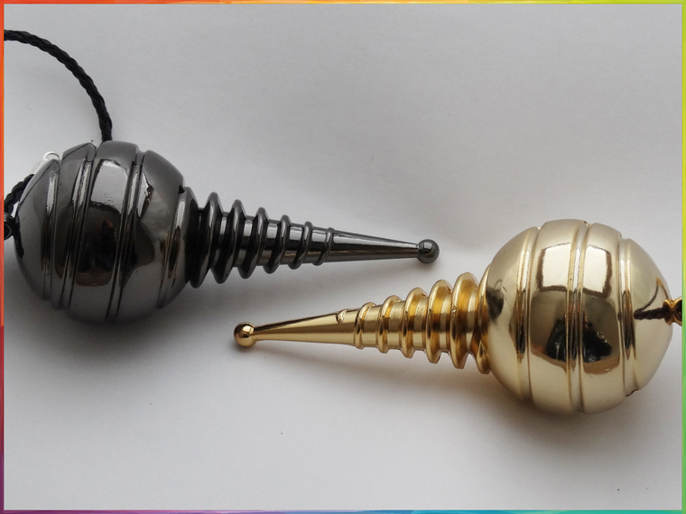 Es una pieza fabricada en zamak, de cuerpo macizo, no contiene nigún secreto en su interior, tan solo el poder de su forma, hay formas en la naturaleza que tienen la particularidad de atraer la energía, tan solo hay que saber apreciarlas y estudiar sus proporciones, para consegtuir resultados positivos, tiene un peso de 300 gramos y unas medidas de 11 cm. de largo y 44 mm. el diámetro de su bola mayor, el baño es de oro o de rutenio y aunque con el tiempo lo pierda, seguirá emitiendo, siempre que no se altere su forma..