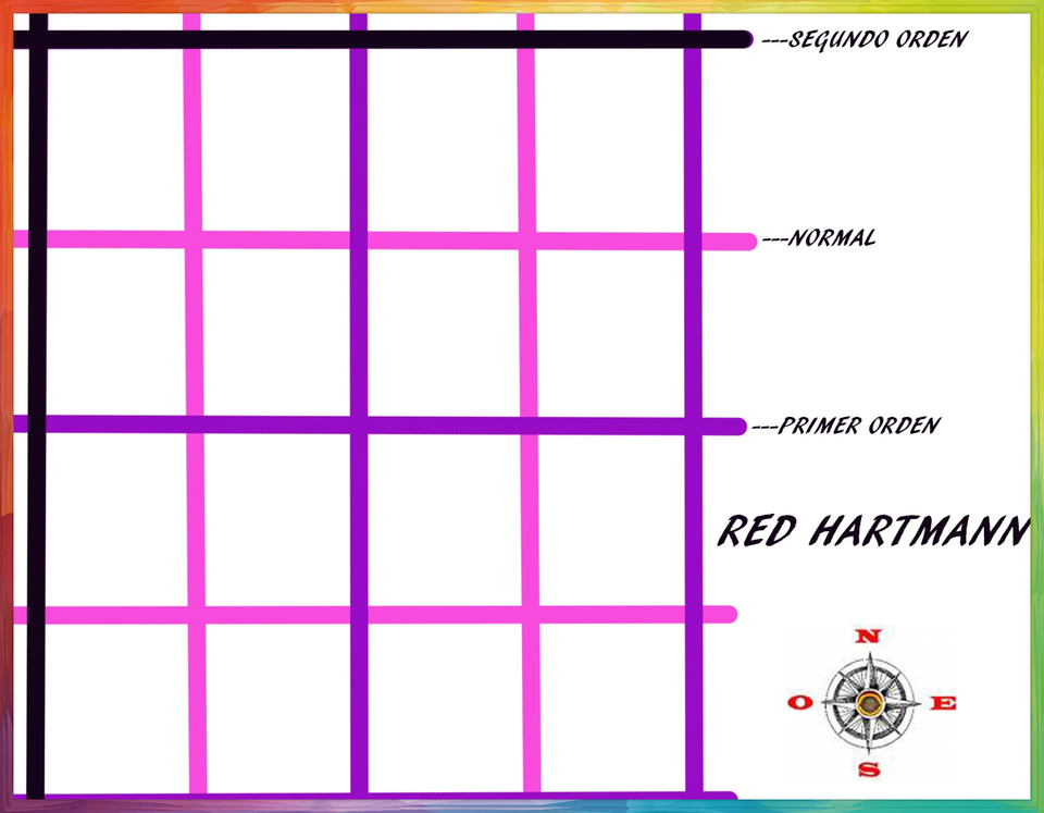 La red Hartmann está formada por franjas en las cuales se registran al menos 6 niveles de radiación distintos (sin tener en cuenta las intersecciones o cruces) distribuidos homogéneamente por todo el planeta. Entiendo que debemos olvidarnos de los armónicos y los cruces de los mismos, las líneas Hartmann simples son las menos peligrosas, pero entiendo que no deben afectar nuestros órganos y el resto de líneas que conforman la red, en algunos casos son realmente peligrosas y sus nudos, cruces o intersecciones, lo son mucho más.